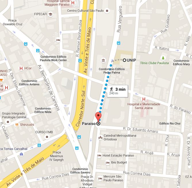 Estação Paraíso do Metro, servida pelas linhas VERDE e AZUL a 240 metros, 3 minutos a pé.